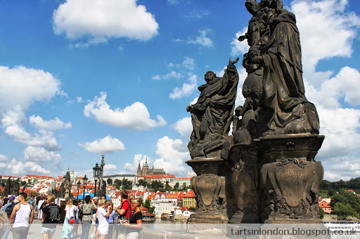 Next stop was the famous Charles Bridge, commissioned by King Charles IV in 1357. It was both beautiful and crowded. As you walk down, the bridge is flanked on either side with old statues, 30 in total, depicting all sorts of religious scenes. Next to those, you'll find the street vendors offering jewelry, caricatures, magnets, and lively street bands making the atmosphere almost like a carnival.