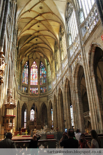 Once we reached the end of the bridge, we began our climb up to Prague Castle. This is actually a complex made up of several different buildings - St Vitus Cathedral, the Royal Palace, St. George's Basilica and Golden Lane. I was most excited St. Vitus as I had read about the beautiful stained glass, which did not disappoint. The glass was the most vibrant colors I had seen in stained glass before, full of reds, bright blues and greens. In addition, some were almost a mosaic, with tiny little pieces of glass adding to their intricacy. The other attractions were nice (with the exception of the Golden Lane), although not much to write home about minus a couple of nice views of the city.