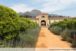 While I could have headed to the airport now and been there a few minutes early, we decided to squeeze in one last tasting. I figured it would be a good practice to help me to sleep on my long overnight flight back to London. We choose the picturesque Waterford Estate in Stellenbosch. The weather was lovely and I got to enjoy an outdoor seat in the sun, under the shade of the trees in their courtyard. Perfection. I got the chance to try three wines and three more chocolates, all lovely, but no space left in my suitcase to bring back. After the last of my wine, I took a few minutes to wander around the estate, with the lovely nectarine trees out front, lining the drive up to the estate.