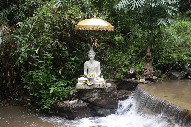 We made a pit stop on our way back into Chiang Mai to another small temple on the river. Being a year later, I can't recall what it was called and an online search doesn't bring up much. It was a quiet, peaceful temple though, still in use, but having fallen victim to the elements in some places. The small river next to it added a symphony of babbles and gurgles as we walked around finding more and more statues around the park. Finally it was really time to hit the road so that our friends could hit the road to the airport.